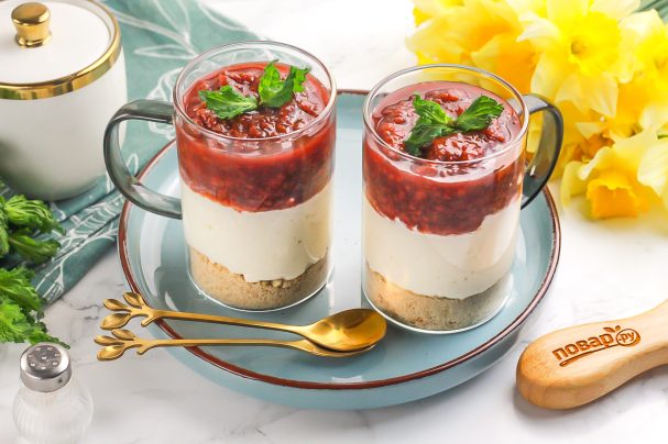 Добавьте сверху варенье или повидло (у меня — малиновое). По желанию можно сначала на крошку выложите варенье, а сверху — творожный слой. Формируйте чизкейк по своему вкусу. Поместите емкости в холодильник минимум на 1 час, а лучше — на ночь. Тогда слой печенья "втянет" в себя влагу из творожной массы и станет мягким. Можно и сразу продегустировать десерт.