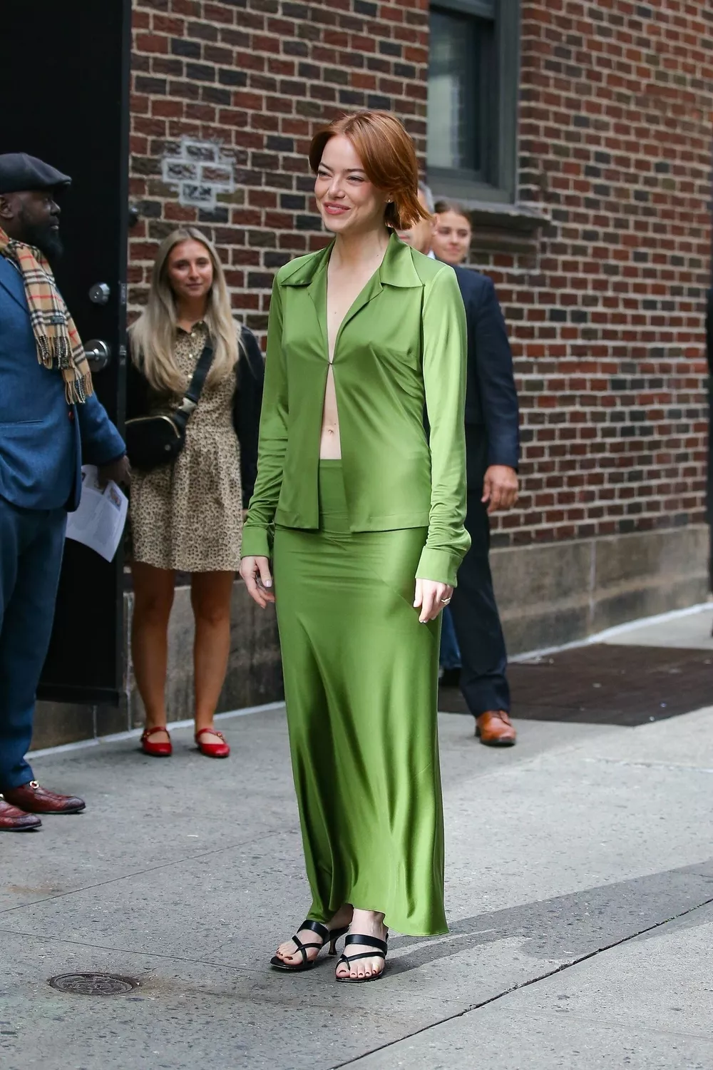 Стоун позировала папарацци на улицах Нью-Йорка, демонстрируя винтажную блузку с длинными рукавами на одной застежке, сочетая его с подходящей юбкой макси из весенне-летней коллекции Донны Каран 1996 года. К костюму звезда выбрала мюли Manolo Blahnik Susa из черной кожи.