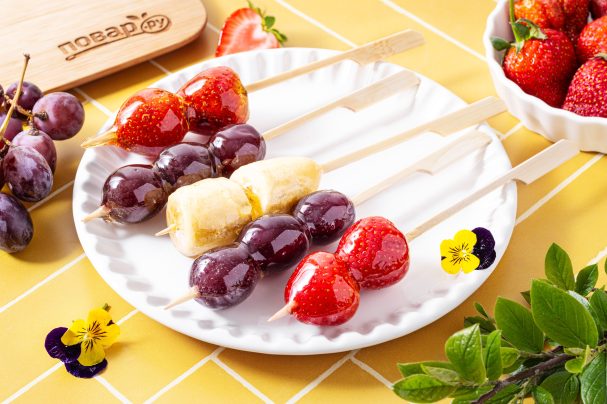 Обмакните в горячую карамель фрукты на шпажке. Чуть прокрутите шпажку, чтобы лишняя карамель стекла.