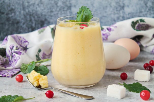 Такой десерт понравится девушкам и женщинам, хотя он и довольно калорийный. По вкусу напоминает гоголь моголь, но с более устойчивой структурой. Если заменить яблочный сок на белое полусухое вино, получится отличный взрослый десерт для вечеринок. Яблочный сок можно заменить на свежевыжатый апельсиновый сок и добавить лимонную цедру.