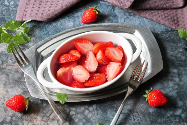Фламбе — это вид термической обработки при помощи горящего спиртного напитка. За это время алкоголь выгорает, а вот вкус и аромат остается. Для фламбе подходит любой крепкий алкоголь не ниже 45 градусов. Алкоголь должен быть теплым, тогда он без проблем загорится и чем крепче он, тем дольше будет гореть. При этом клубника будет мягче, но поверхность обгорит. Клубнику фламбе можно подавать самостоятельно или вместе с шариком мороженого.