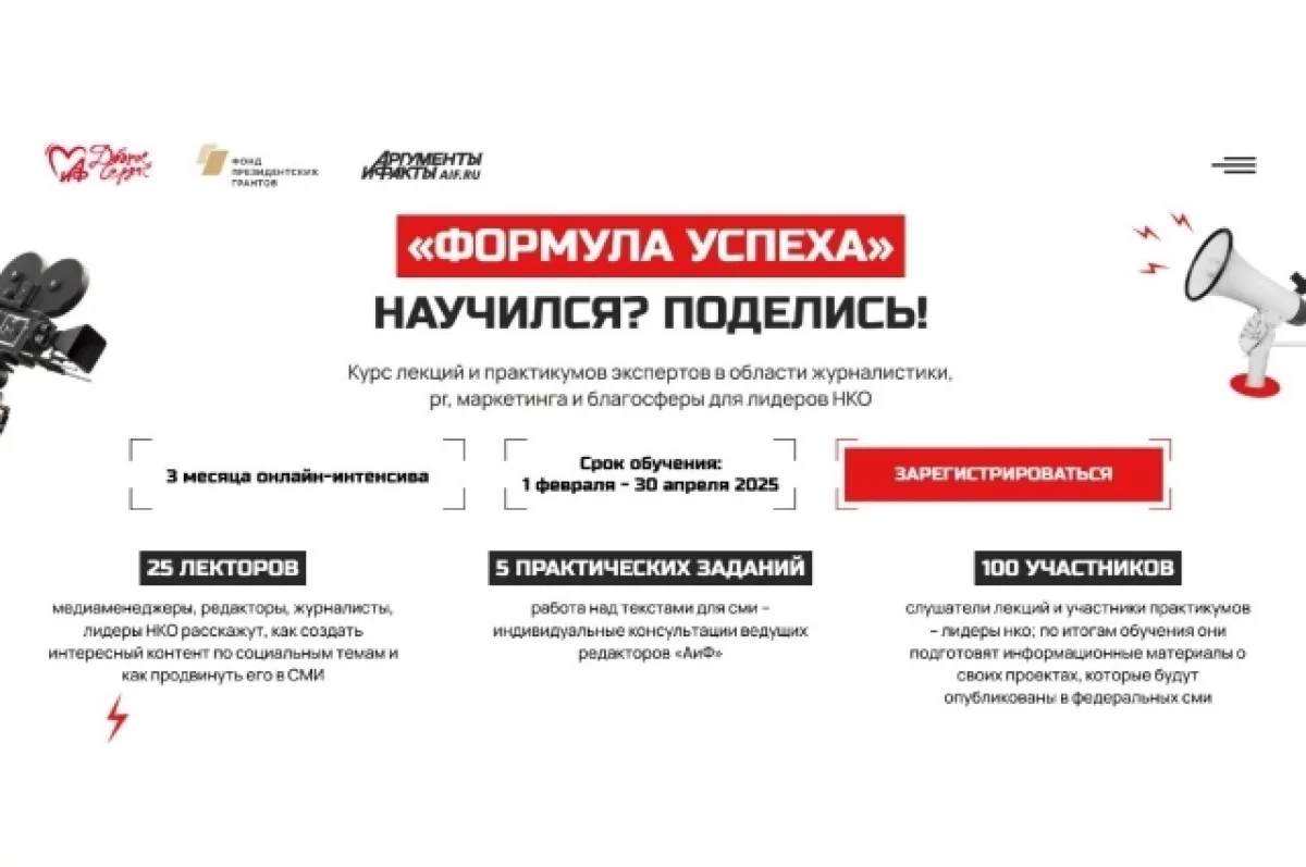 Обучение в онлайн-интенсиве «Формула успеха. Научился? Поделись!» продлится до 30 апреля. Помимо прослушивания лекций каждый участник выполнит 5 практических заданий, в том числе запишет подкаст. Все созданные в ходе интенсива материалы будут также участвовать в творческом конкурсе, победителей которого определят менторы, наставники проекта и читатели «АиФ».