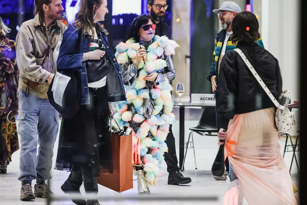 На вечеринке Бьорк появилась в эффектном наряде: серебристом комбинезоне, расшитом разноцветными перьевыми помпонами, золотистых таби и футуристичных массивных солнцезащитных очках. Артистка дополнила образ темной помадой синего оттенка, а волосы оставила распущенными.