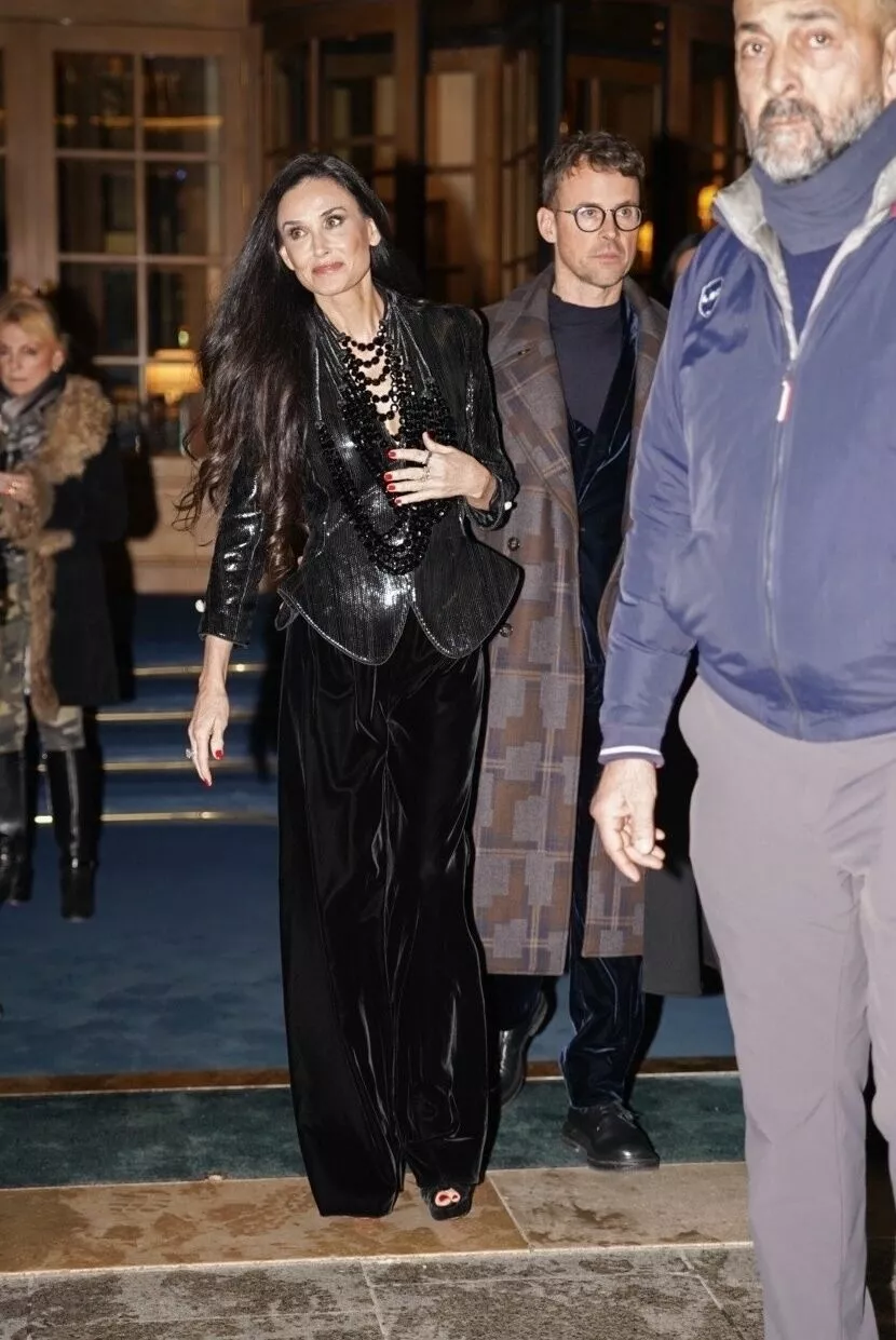 Для светского выхода 62-летняя Мур выбрала элегантный брючный образ. Актриса примерила структурированный черный жакет из блестящей кожи, сидящий идеально по фигуре, и сочетала его с широкими бархатными брюками, а дополнила наряд босоножками и несколькими рядами сверкающих бус.