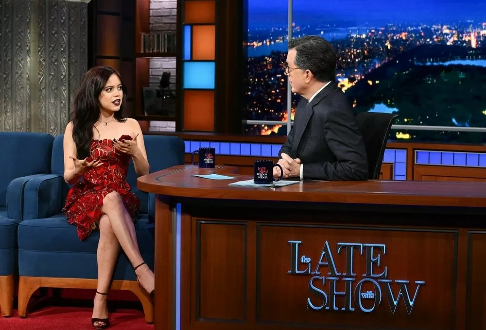 22-летняя Дженна Ортега продолжает совершенствовать свой персональный стиль, все чаще появляясь на светских мероприятиях и телепередачах в нетривиальных образах. Так, во вторник вечером, 25 марта, актриса стала гостьей очередного выпуска «Позднего шоу со Стивенм Кольбером», которое снимается в Нью-Йорке.