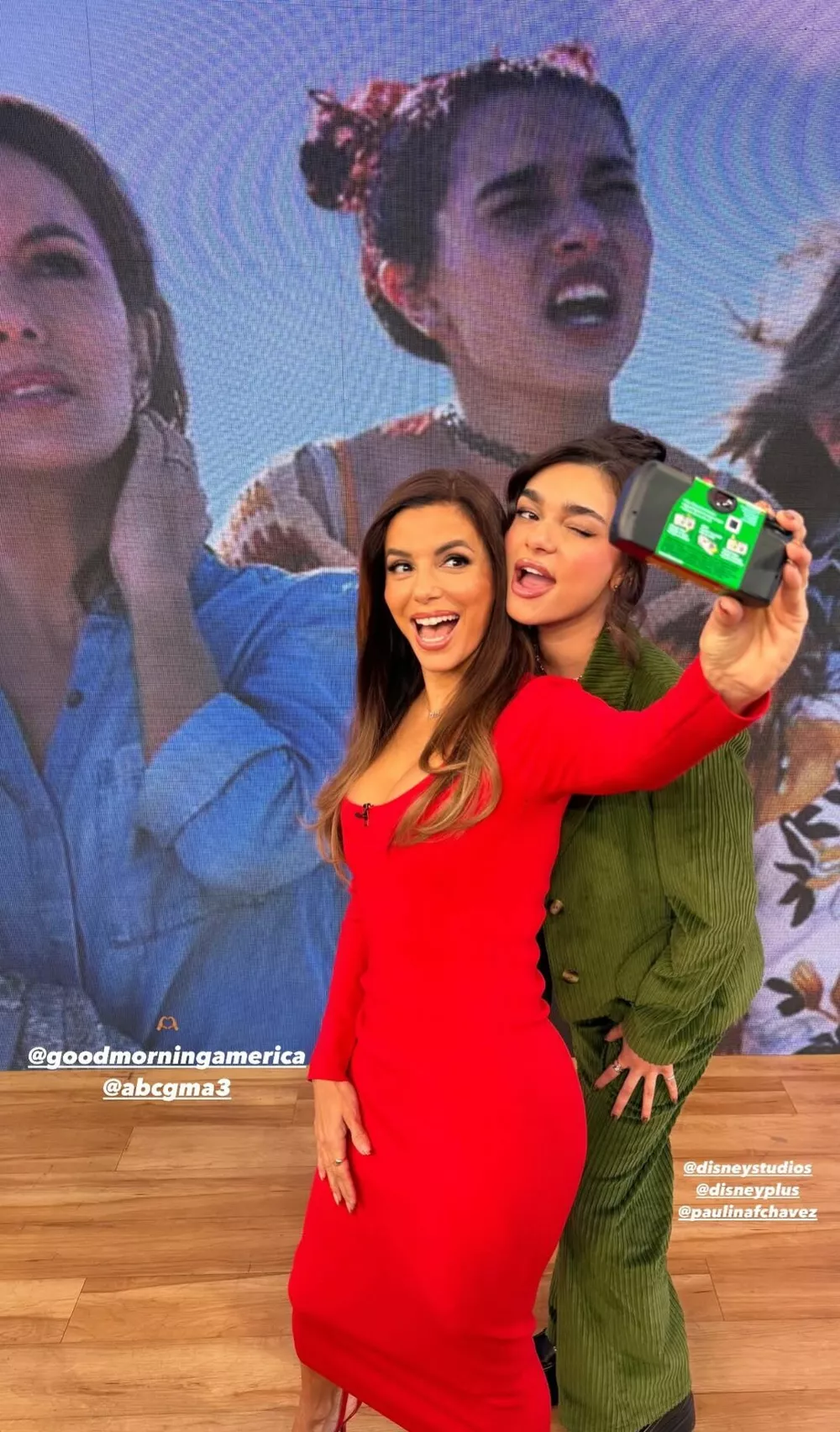 Ева уложила длинные темные волосы прямыми локонами, а из аксессуаров выбрала ожерелье из белого золота и маленькие серьги-кольца. Кинозвезда также сфотографировалась с коллегой по фильму «Александр и ужасная, кошмарная, нехорошая, очень плохая поездка» Паулиной Чавес, которая играет в фильме ее дочь.