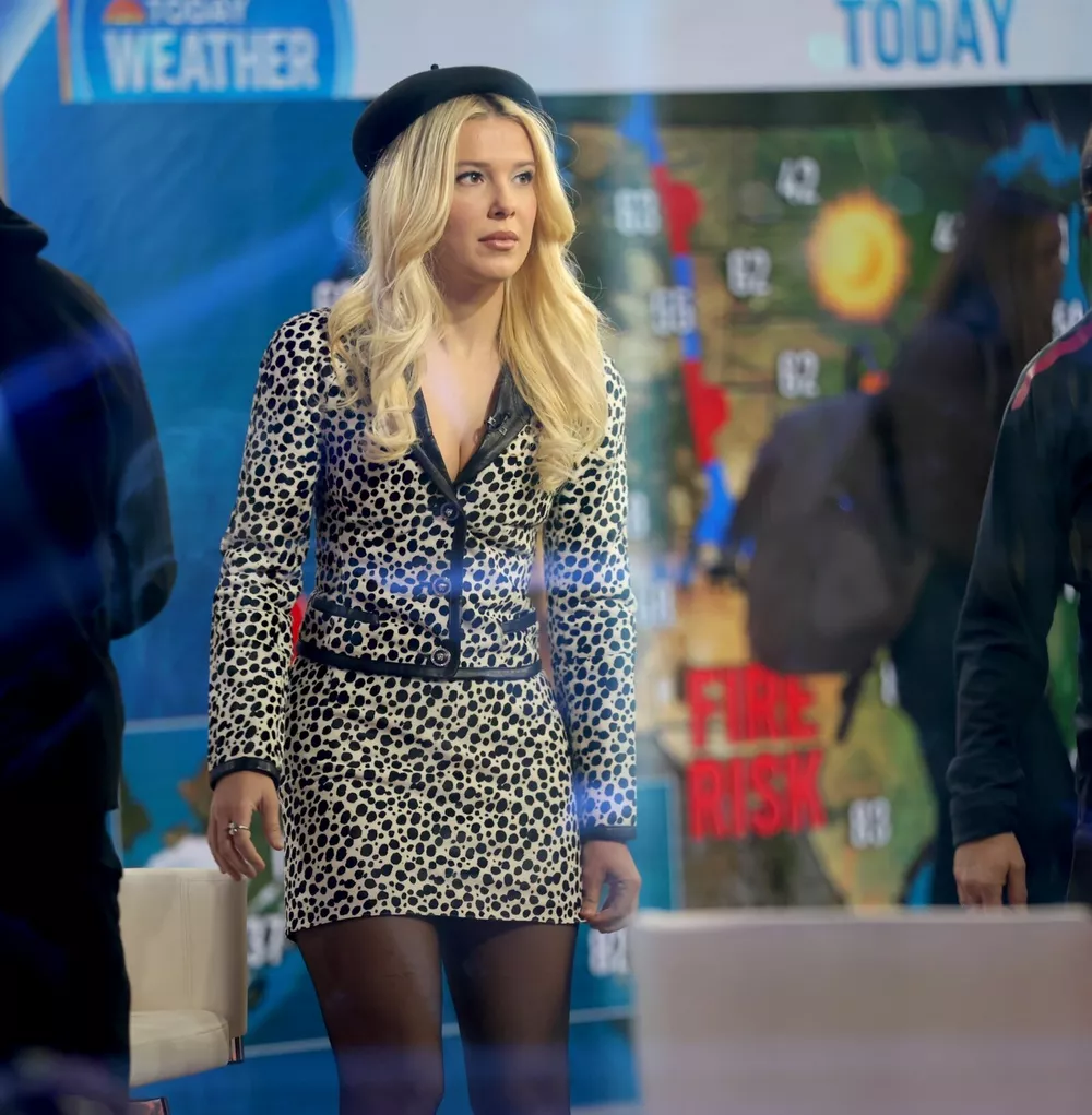 Однако это был не единственный эффектный наряд Милли в тот день: ранее утром ее можно было увидеть на “The Today Show”, где она побывала в черно-белом наряде от Versace и винтажном черном берете.