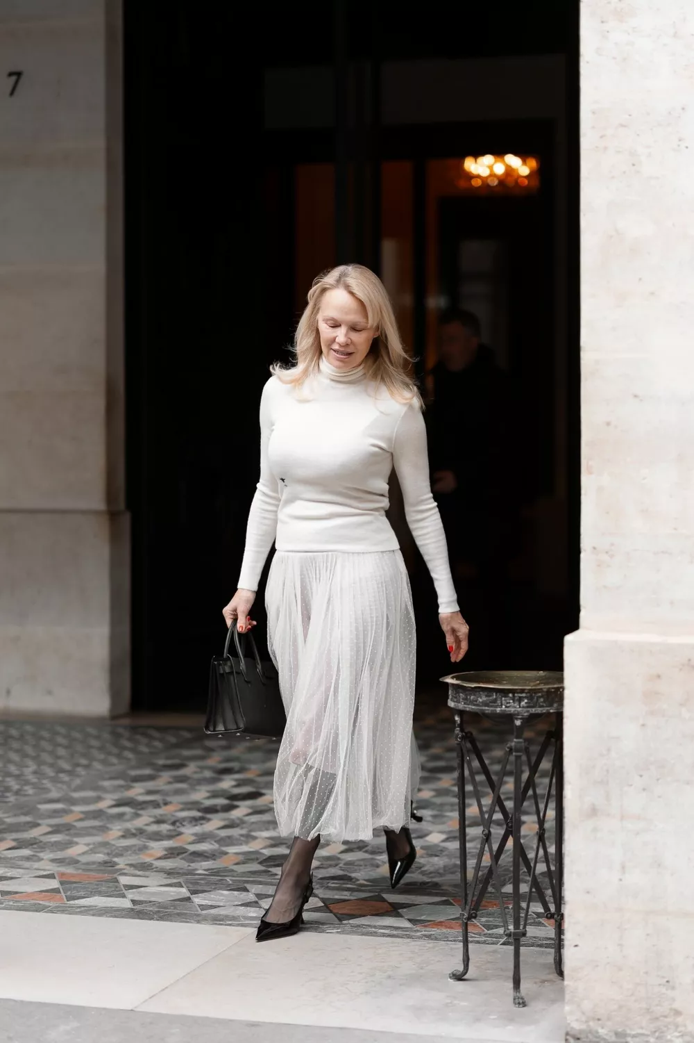 57-летняя Памела Андерсон за последний год приобрела статус настоящей иконы стиля, которая не боится монохромных нарядов и практически всегда появляется на публике без макияжа, чем неизменно восхищает поклонников. На днях актрису заметили выходящей из роскошного пятизвездочного отеля Hotel Costes в центре Парижа в очередном лаконичном образе.