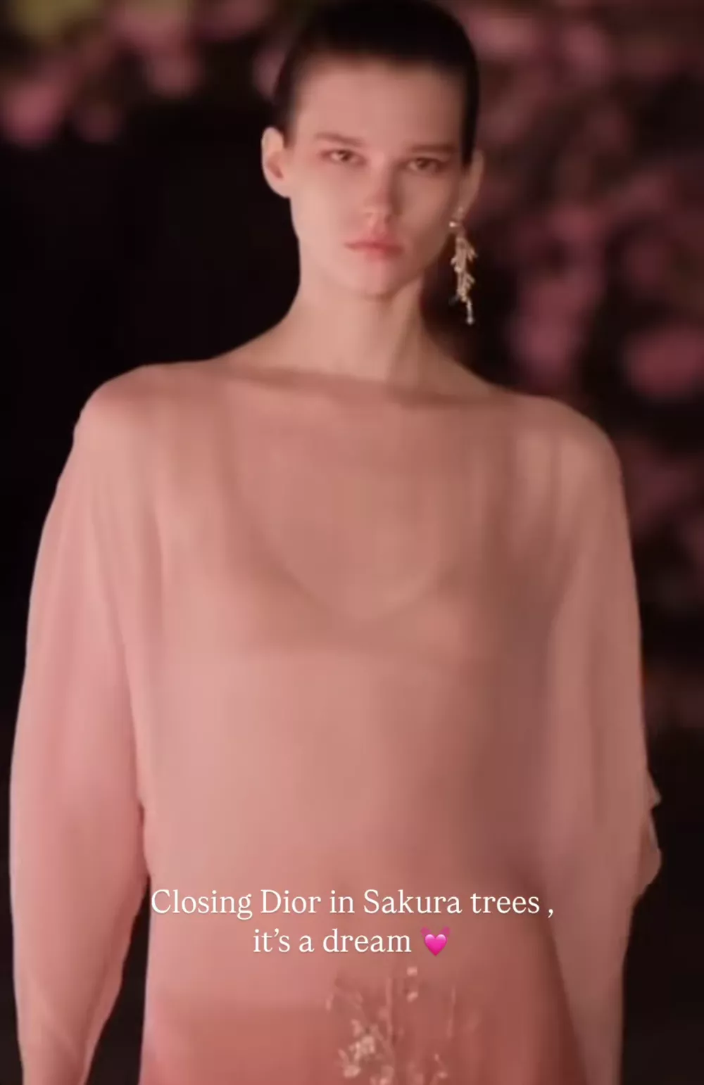 Сандра, чье настоящее имя Александра Волобуева, приняла участие в показе коллекции осень-зима Pre-Fall 2025 от Dior, который прошел в уникальном месте – в цветущем саду рядом с древним храмом То-дзи в Киото — объектом Всемирного наследия ЮНЕСКО. Девушка прошла по дорожке парка среди цветущих сакур в розовом полупрозрачном платье с цветочной вышивкой ручной работы. Стилисты дополнили образ длинной серьгой на одном ухе и кожаными босоножками на плоской подошве.