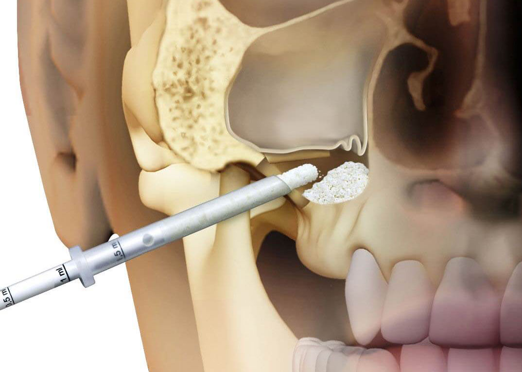 - Заполнение образовавшегося пространства костным материалом: врач заполняет пространство между слизистой оболочкой и костью костным материалом.