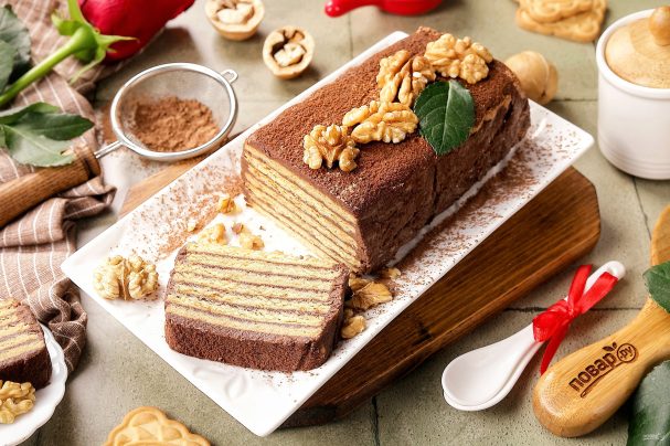 Если готовите торт для детей, можно использовать для пропитки молоко, сладкий чай, шоколадный сироп или не пропитывать торт вовсе. Печенье можете взять то, которое больше любите.
